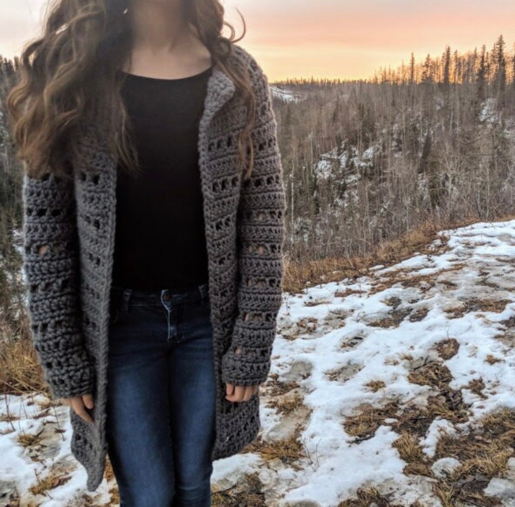 The Chilli Days Cardi is perfect for those cold winter days! It uses super bulky yarn, so it works up fast and is super warm!